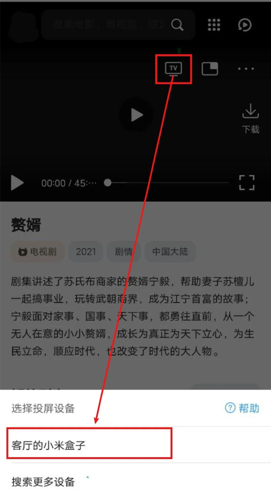打开QQ浏览器(会接管网页播放器)->打开高清视频分享大全 ->播放视频->选中投屏图标->等待搜寻出智能电视/电视盒子->选中,即可投屏。